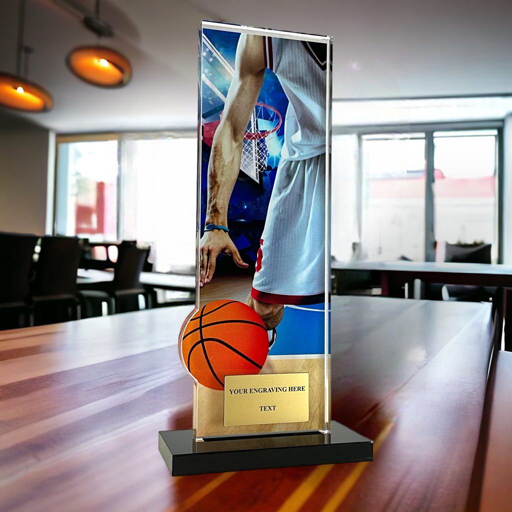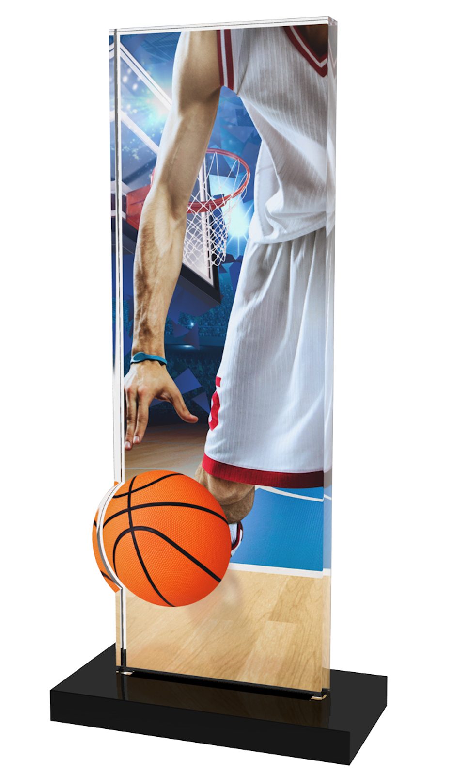 The Apla Basketball Player Trophy is a uniquely styled award. Expertly cut to shape this trophy features a high quality full color print on the reverse side of the 3/8" thick acrylic mounted on a black acrylic base.