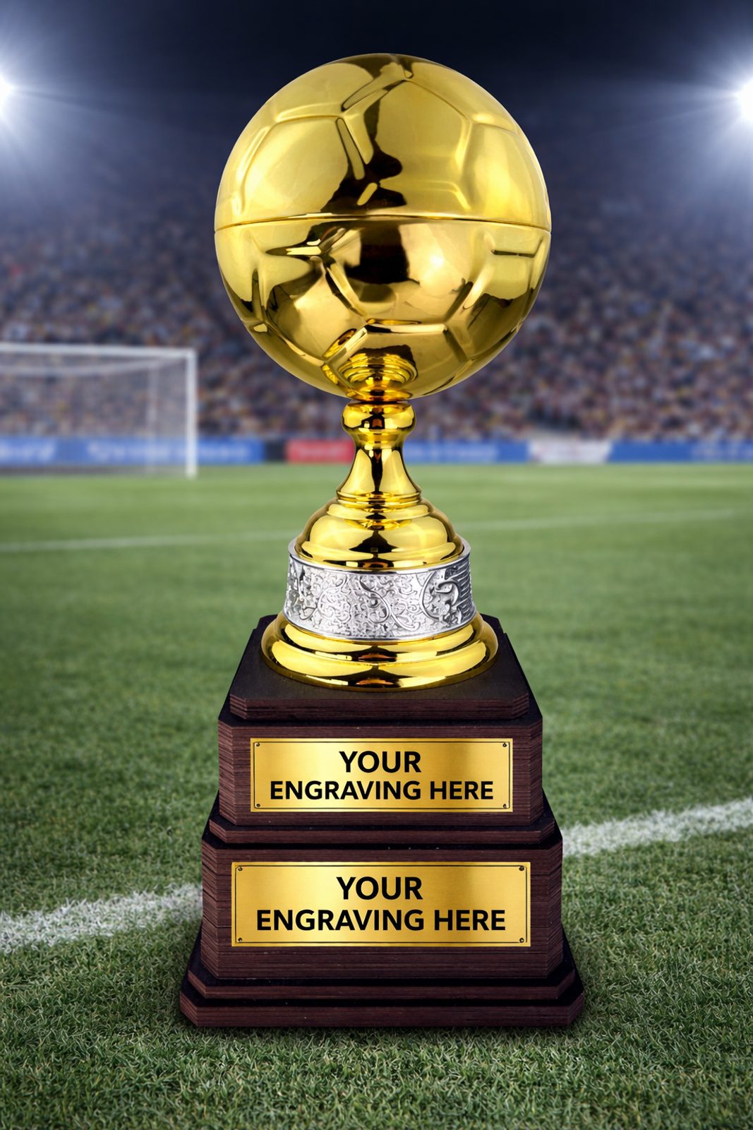 Premium soccer trophy with a solid birch wood base (made in-house) and a full metal construction—including the stem and soccer ball top. Clean, modern design with custom gold engraving plates included. Available in 3 sizes (22 3/4", 21", 20 1/4").