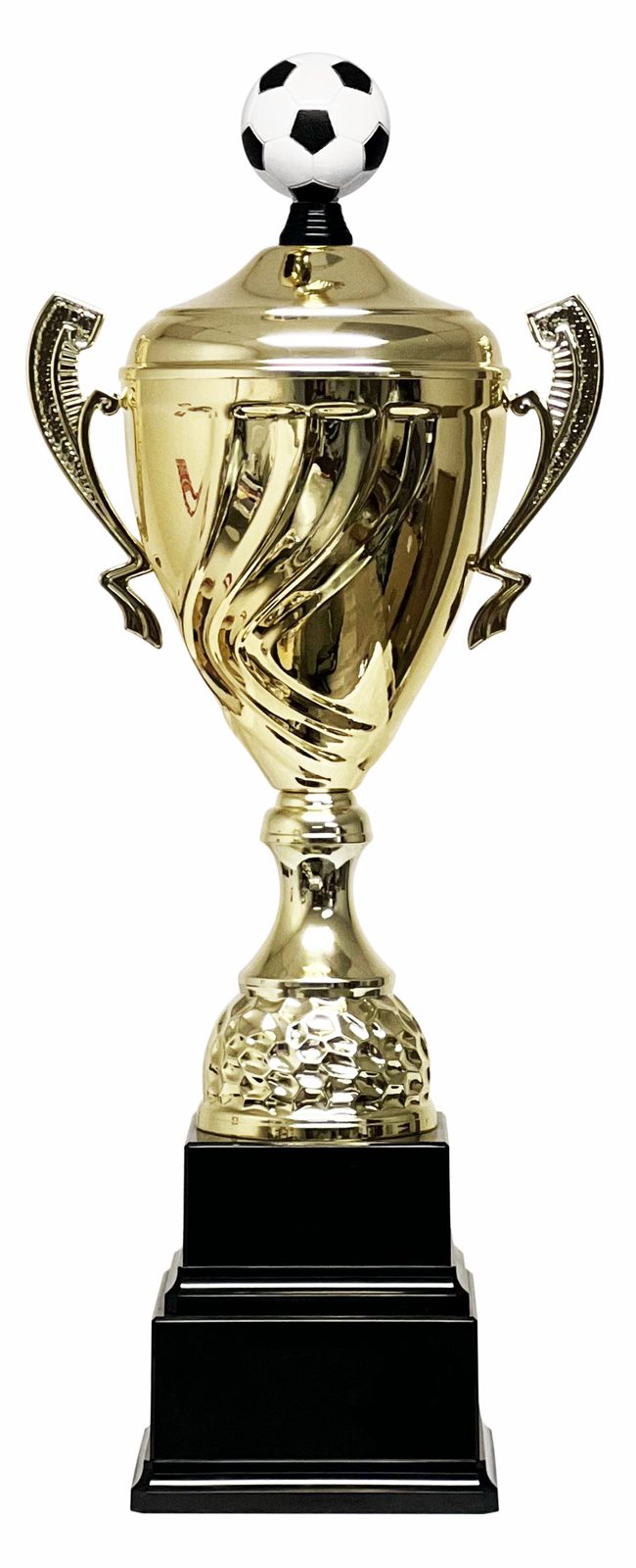 It is made with an extra large gold metal bowl, handle and lid. On top of the lid is a fixed contemporary Soccer figure. These are built above a premium quality thick plastic stem. The cup sits on an exclusive weighted double-tiered plinth. The additional space on the extra base makes this cup the perfect choice for an annual award. It stands at a mega 29½"!