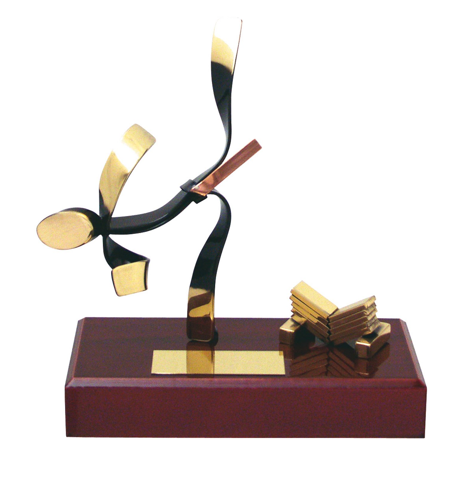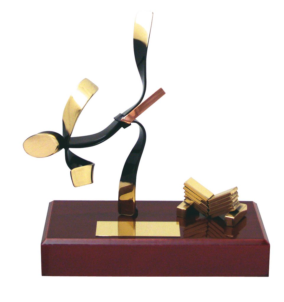 The Barcelona Karate Trophy is an exclusive handmade metal award. It is mounted onto a high quality polished wooden base. The award is part of an exclusive collection of awards that are handmade in Barcelona, Spain. Each trophy is hand crafted from high quality metals, including brass, copper, nickel, pewter and steel and are set upon either wooden or marble bases.