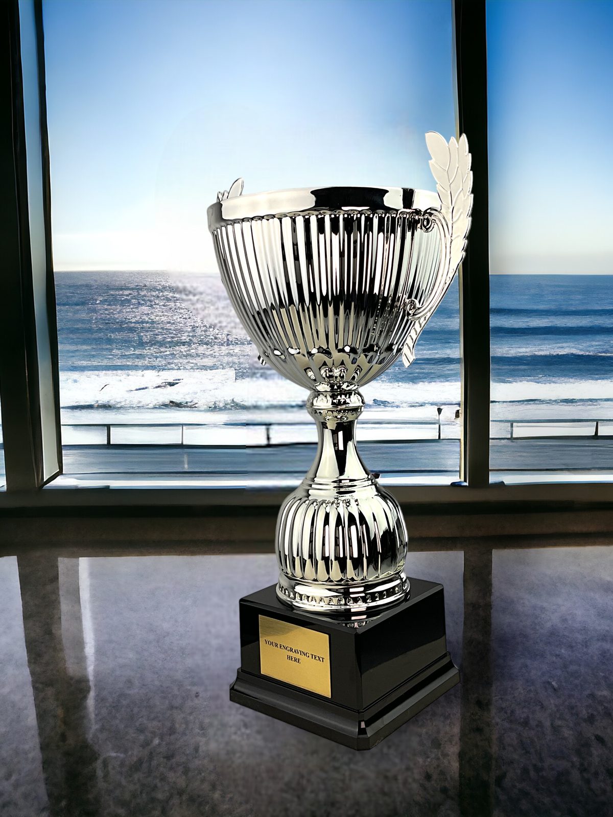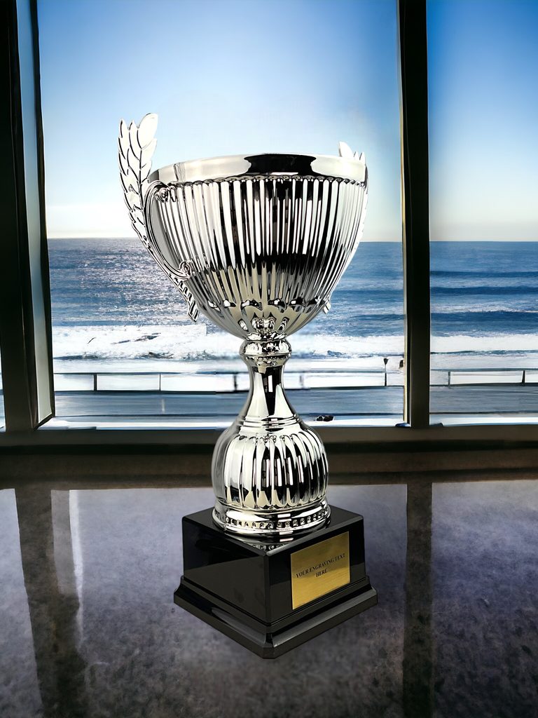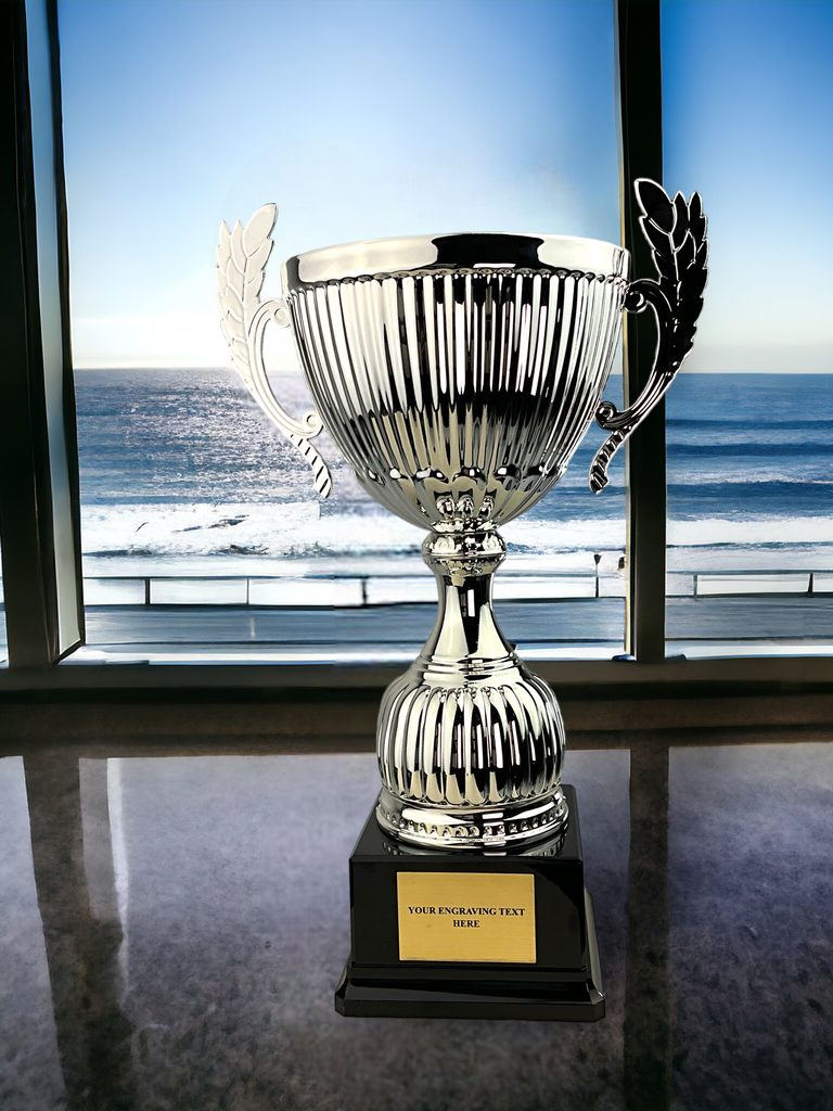 The Beeville Silver Luxury Cup is a luxury silver contemporary award. Consisting of a black weighted PVC base, with a silver plastic stem and a deep metal bowl. Comes in 3 large sizes 14",13",11".