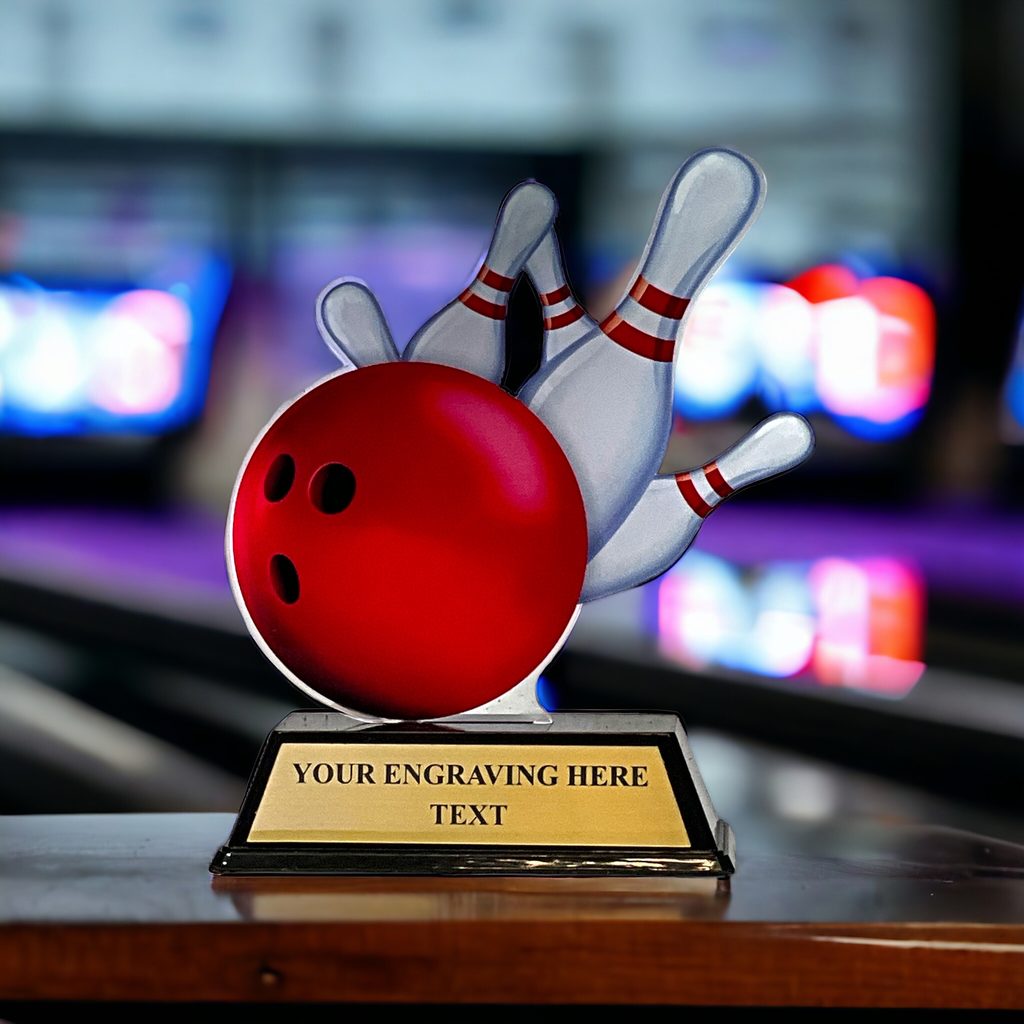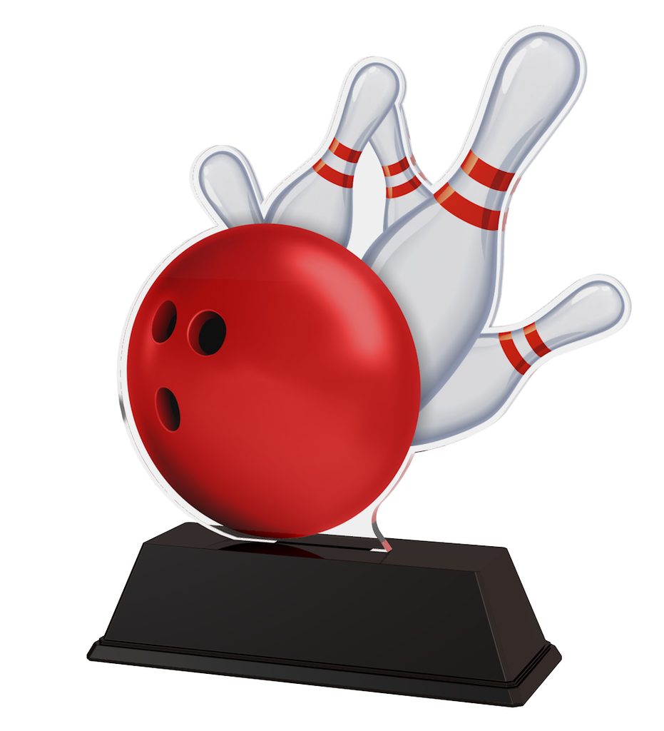A contemporary designer bowling trophy. Cut to shape this award comes to life with a high quality full colour print on the reverse side of the 1/8" thick acrylic mounted on a black PVC base.