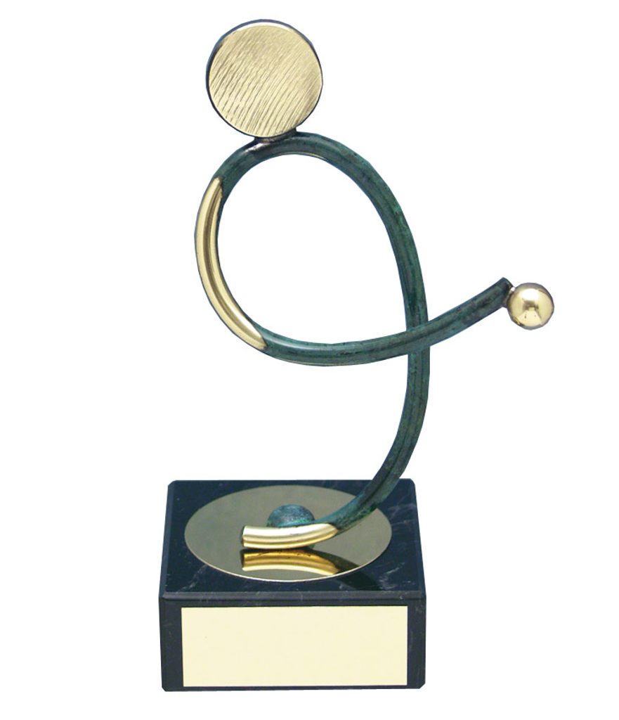 The Bilbao Petanque Trophy is an exclusive handmade metal award displaying an artistic bowls player in action. This is then mounted onto a high quality black marble base. The award is part of an exclusive collection of awards that are handmade in Barcelona, Spain. Each trophy is hand crafted from high quality metals, including brass, copper, nickel, pewter and steel and are set upon either wooden or marble bases.