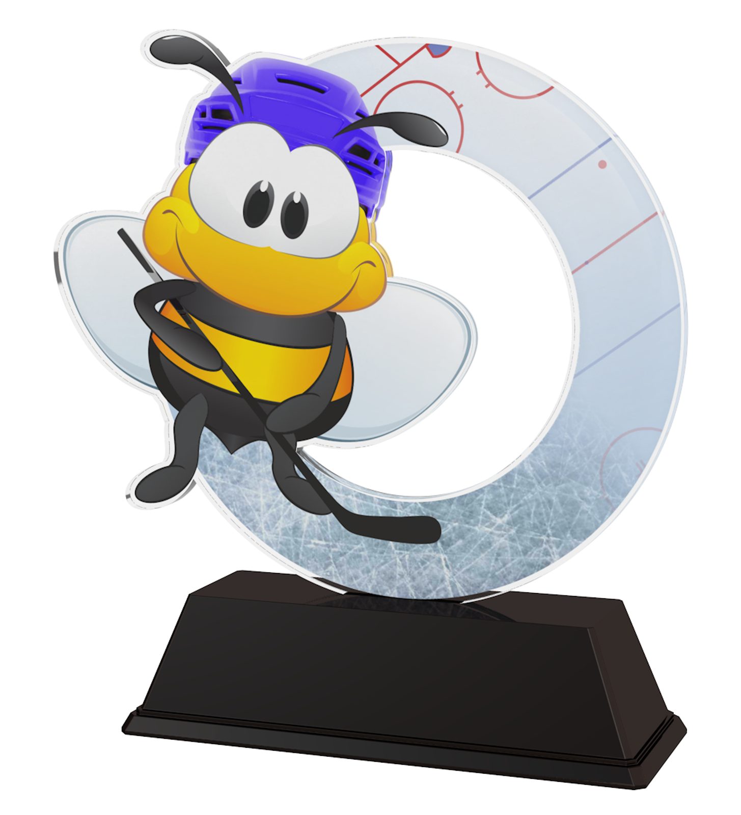 The Bumble Bee Ice Hockey Trophy is the cutest in design for kids. Cut out to shape this trophy comes to life with a high quality full color print on the reverse side of the 5/32" thick acrylic mounted on a black PVC base.