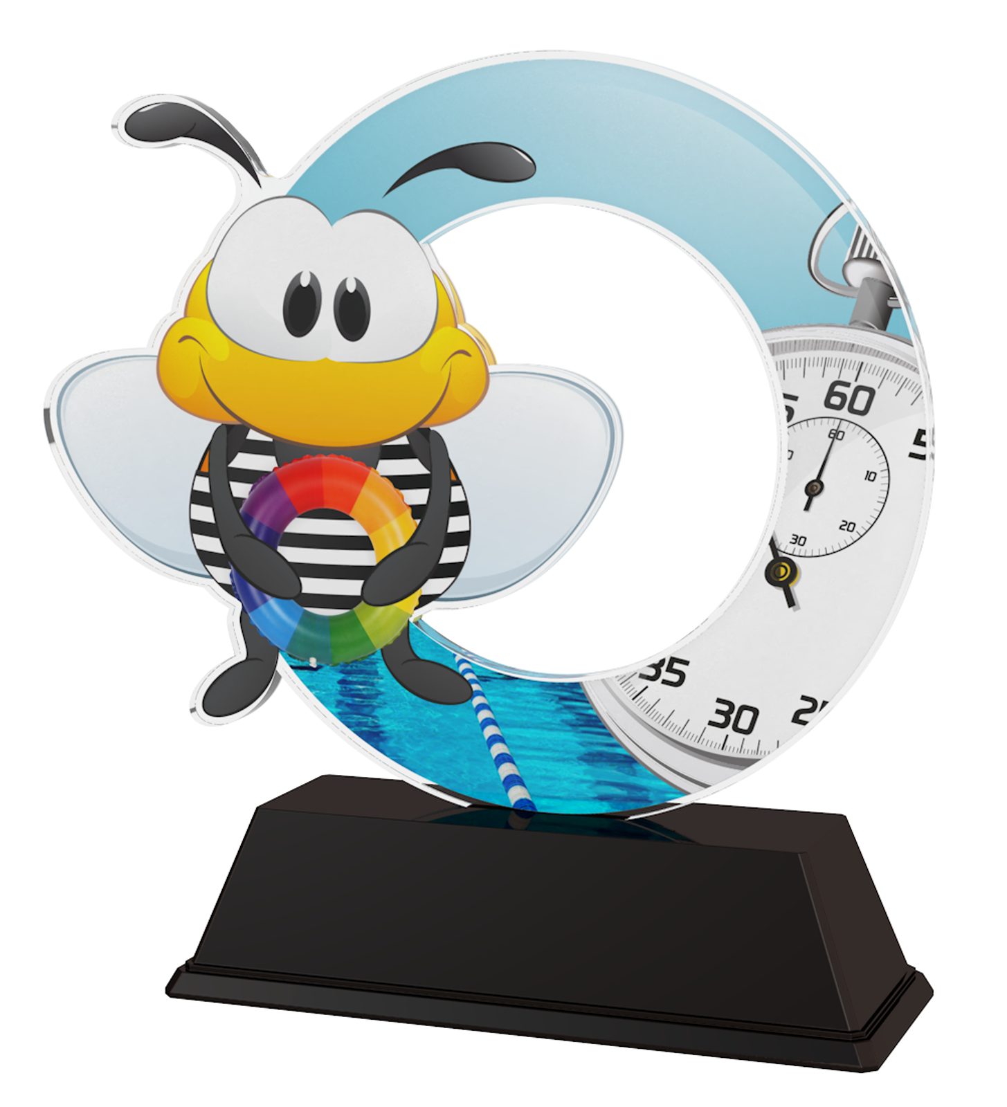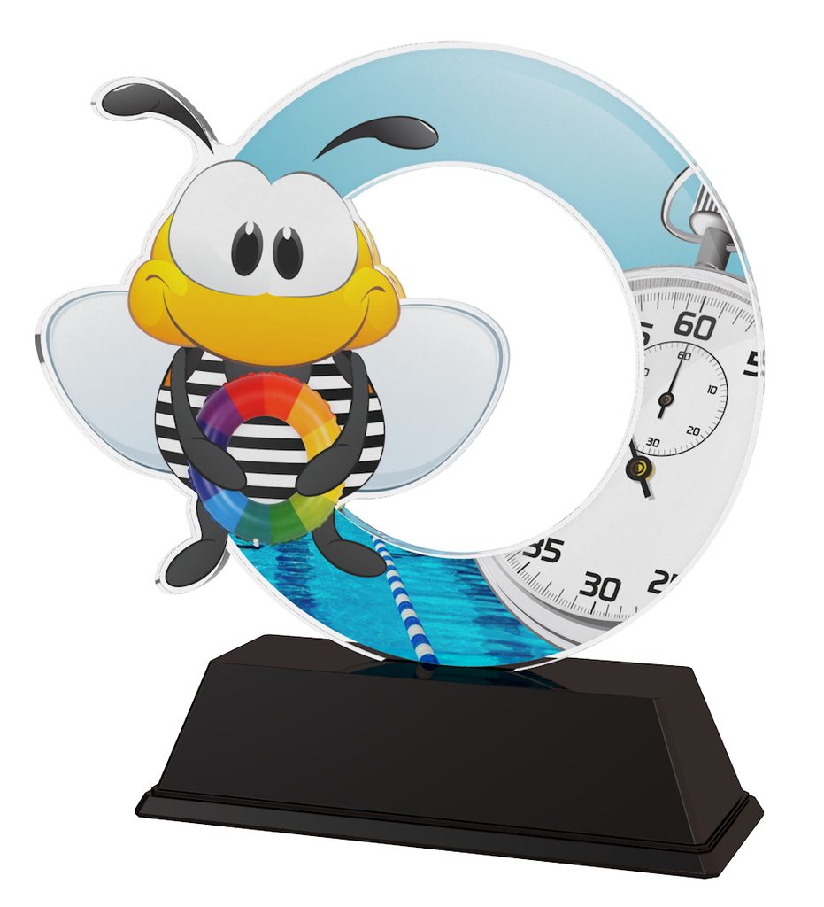 The Bumble Bee Swimming Trophy is the cutest in design for kids. Cut out to shape this trophy comes to life with a high quality full color print on the reverse side of the 5/32" thick acrylic mounted on a black PVC base.