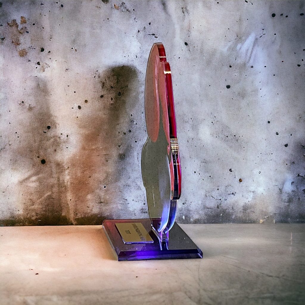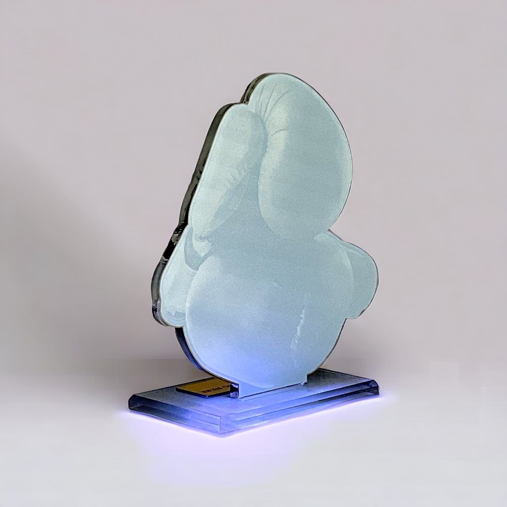 Acrylic Trophy 1/4" thick with acrylic base 5/16" thick. Possibility to put a label on the base. The width of the trophy is only indicative, it may vary depending on the theme of the trophy.