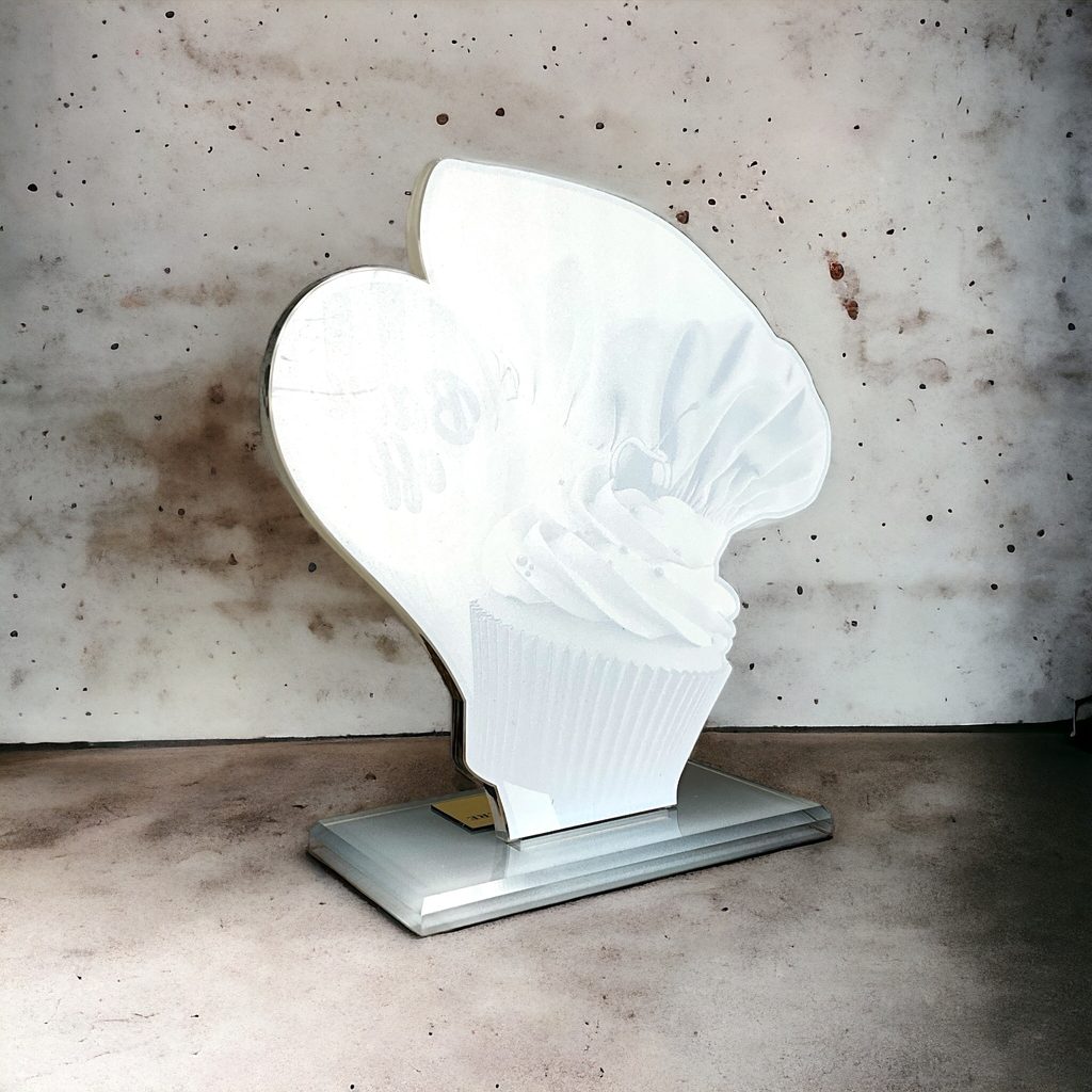 Acrylic Trophy 1/4" thick with acrylic base 5/16" thick. Possibility to put a label on the base. The width of the trophy is only indicative, it may vary depending on the theme of the trophy.