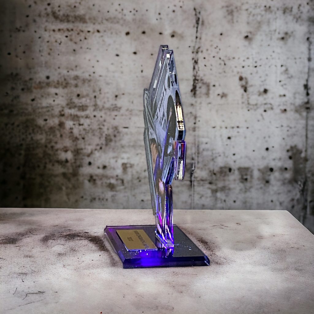 Acrylic Trophy 1/4" thick with acrylic base 5/16" thick. Possibility to put a label on the base. The width of the trophy is only indicative, it may vary depending on the theme of the trophy.