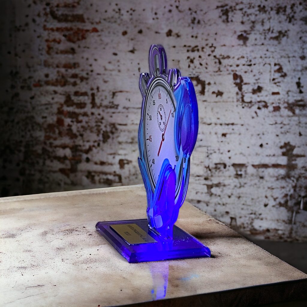 Acrylic Trophy 1/4" thick with acrylic base 5/16" thick. Possibility to put a label on the base. The width of the trophy is only indicative, it may vary depending on the theme of the trophy.