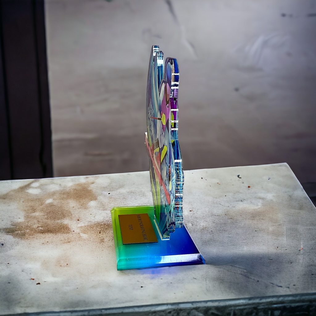Acrylic Trophy 1/4" thick with acrylic base 5/16" thick. Possibility to put a label on the base. The width of the trophy is only indicative, it may vary depending on the theme of the trophy.