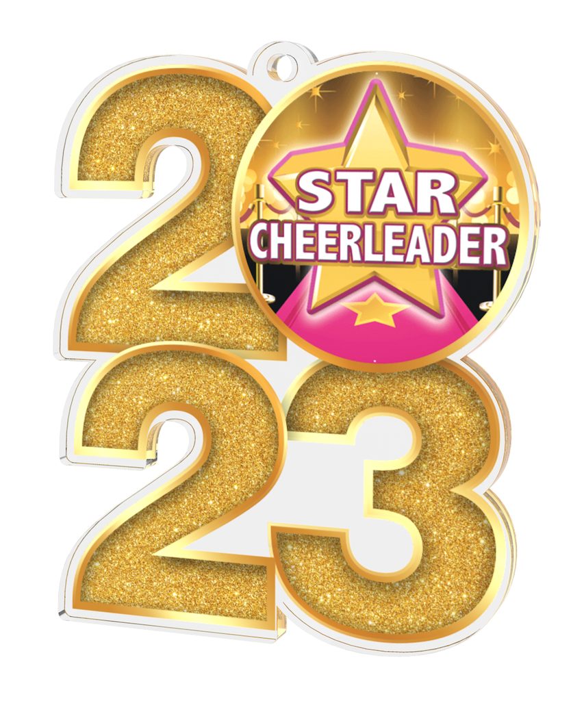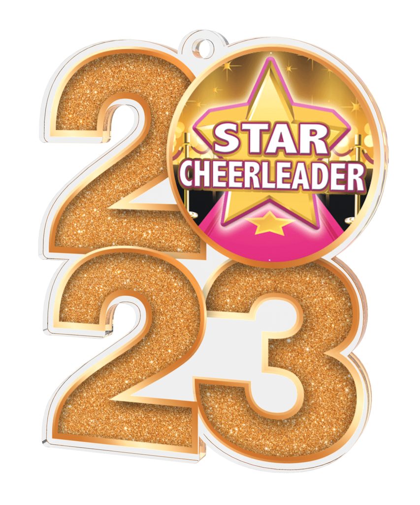 The Cheerleader Star 2023 Acrylic Medal is part of a brand new exciting exclusive range available in a gold, silver or bronze finish. Made in a large size of 2 3/4" (h) x 2 1/2" (w).