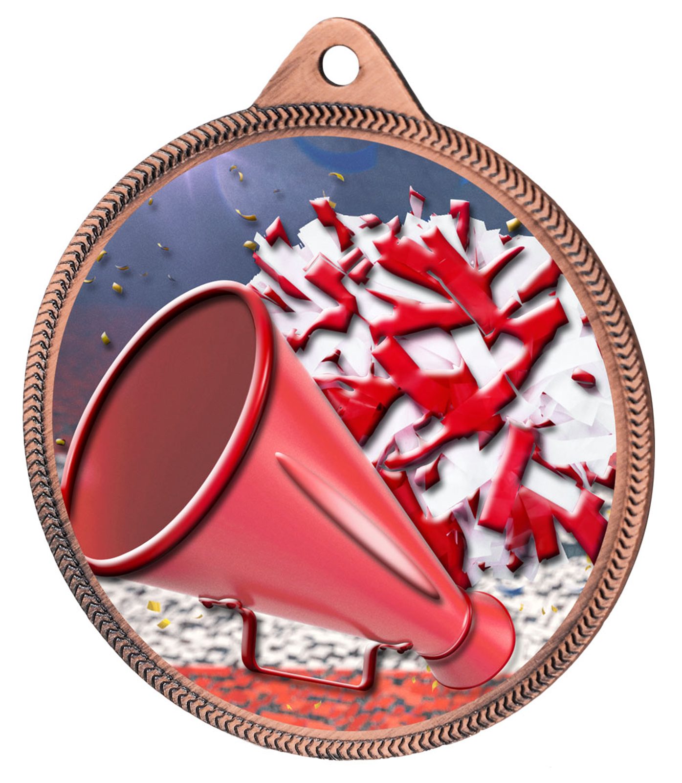A truly superb new Cheerleading 2 1/8" medal made from iron. The medal has been printed using the latest 3D texture coating making the medal come alive with a vibrant raised full color print. Give your next presentation a lift with these contemporary medals which are sure to make eyes light up when received!