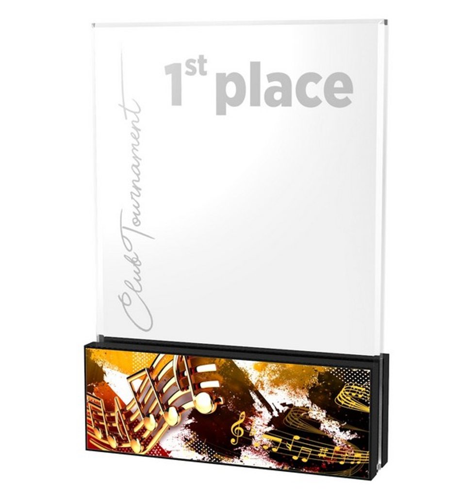 The City Printed Acrylic Music Award is an ingenious new in-house-made trophy.  This award is made using 0.4" thick premium acrylic mounted in between two pieces of shaped black 0.4" thick acrylic. This gives the trophy a very professional sturdy base.