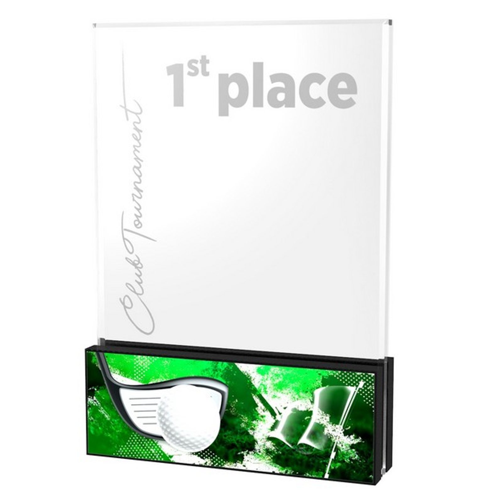 The City Printed Acrylic Golf Award is an ingenious new in-house-made trophy.  This award is made using 0.4" thick premium acrylic mounted in between two pieces of shaped black 0.4" thick acrylic. This gives the trophy a very professional sturdy base.