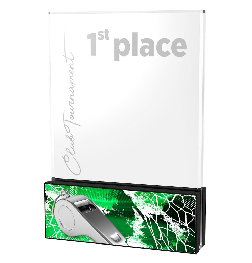 The  City Printed Acrylic Referee Award is an ingenious new in-house-made trophy.  This award is made using 0.4" thick premium acrylic mounted in between two pieces of shaped black 0.4" thick acrylic. This gives the trophy a very professional sturdy base.