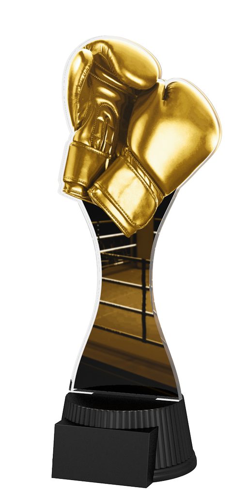 The Classic Toronto Boxing Gloves Trophy offers a classic twist on a modern award. With superb shape this trophy comes to life with a high quality sepia-styled double sided print on ¼" thick acrylic mounted on a black PVC base.