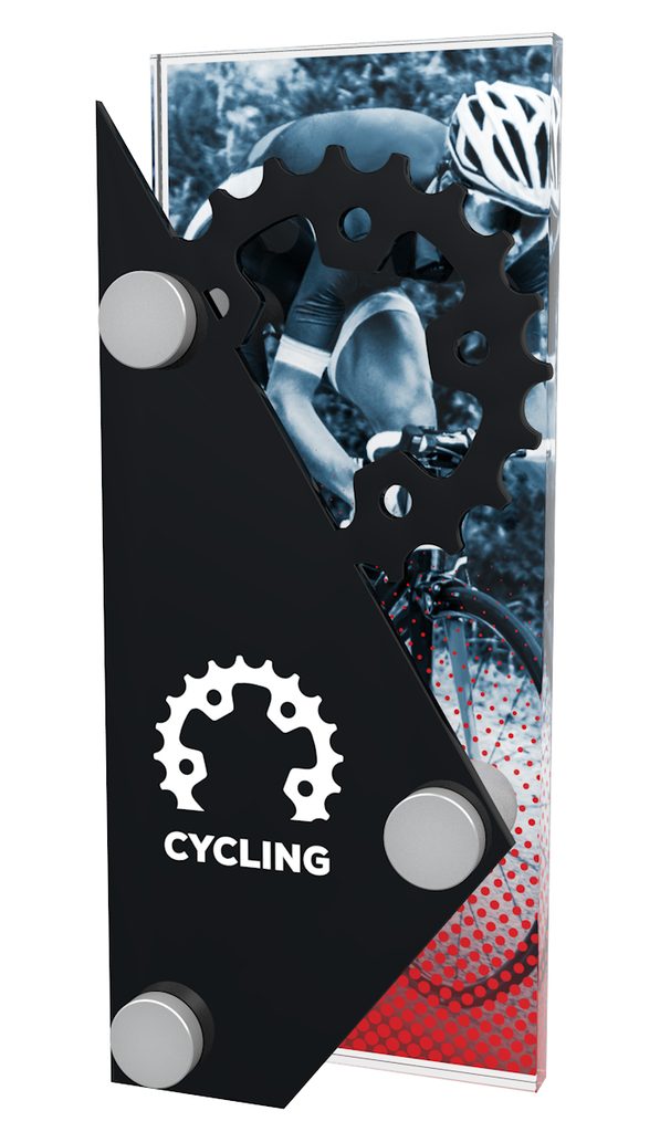 The Cordoba Trophy is made from two pieces of acrylic. These are connected by using three steel screw fittings. The back piece is a 3/8"thick piece of high quality printed acrylic, and the front piece is laser cut black acrylic. The trophy comes in three great sizes.