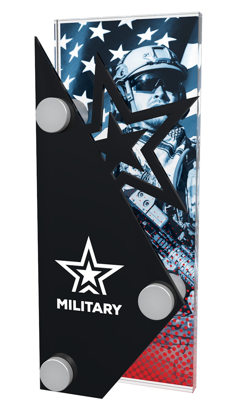 The Cordoba Trophy is made from two pieces of acrylic. These are connected by using three steel screw fittings. The back piece is a 3/8"thick piece of high quality printed acrylic, and the front piece is laser cut black acrylic. The trophy comes in three great sizes.
