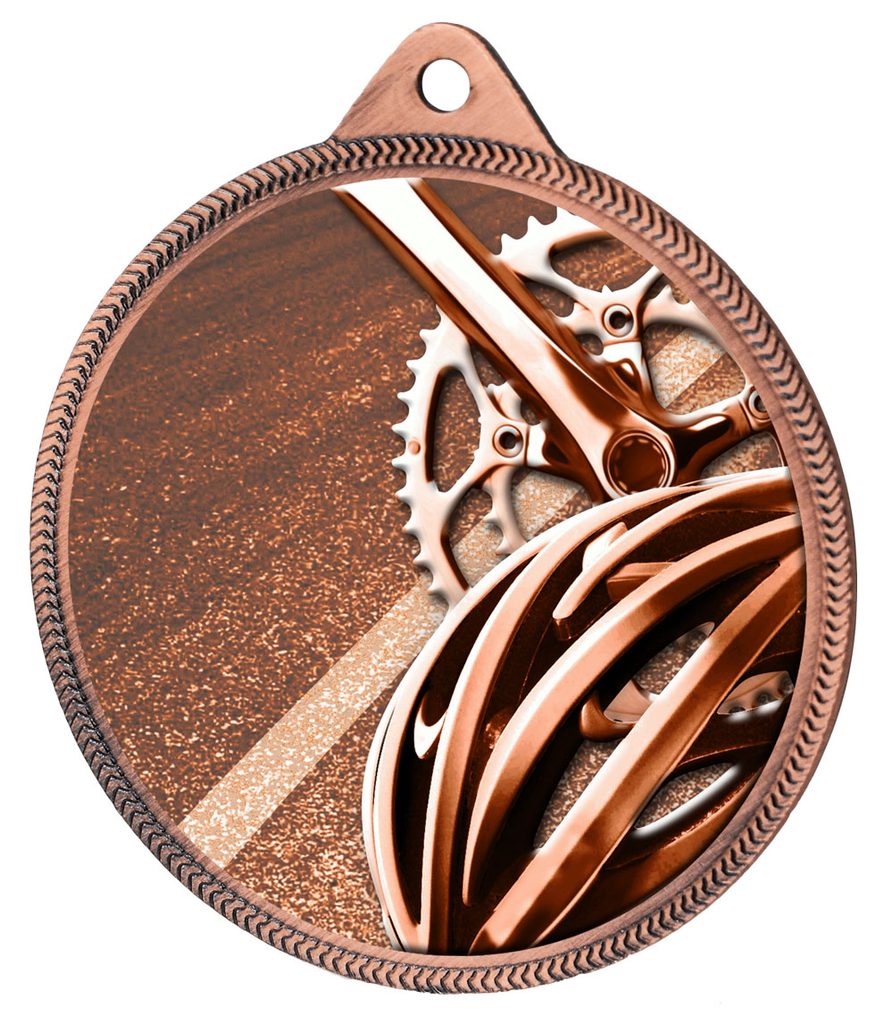 A truly superb new Cycling 2 1/8" medal made from iron. The medal has been printed using the latest 3D texture coating making the medal come alive with a fantastic raised antique color print. Give your next presentation a lift with these contemporary medals which are sure to make eyes light up when received!