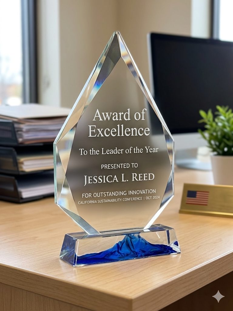 Celebrate exceptional achievements with our striking optical glass trophy, featuring a sleek, modern design. Precision-crafted from premium-quality, ½-inch-thick optical glass, this award radiates sophistication and clarity. Its crystal-clear surface provides ample space for personalized engraving, perfectly highlighting names, logos, or special messages. Ideal for corporate honors, prestigious events, and notable accomplishments.