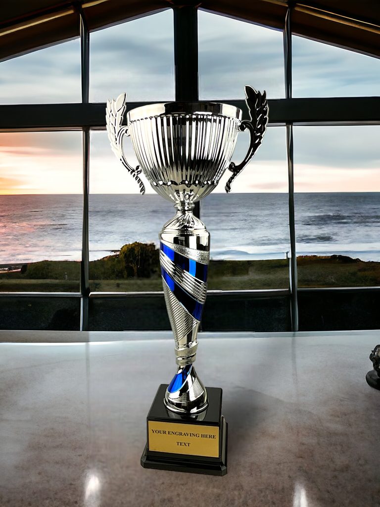 Denver Silver and Blue Cup on a Black PVC Base