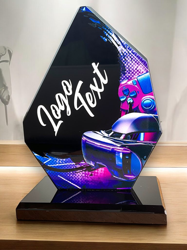 Introducing a stunning shiny black acrylic award, designed to captivate with its sleek and modern appeal. This award features a unique front structure print that is enhanced with a special structure varnish finish, providing a textured and polished look. Available in four different sizes and four vibrant colors, this award is perfect for any occasion where elegance and sophistication are key. The combination of high-quality acrylic and the eye-catching varnish gives it a durable, professional appearance that stands out in any presentation setting.