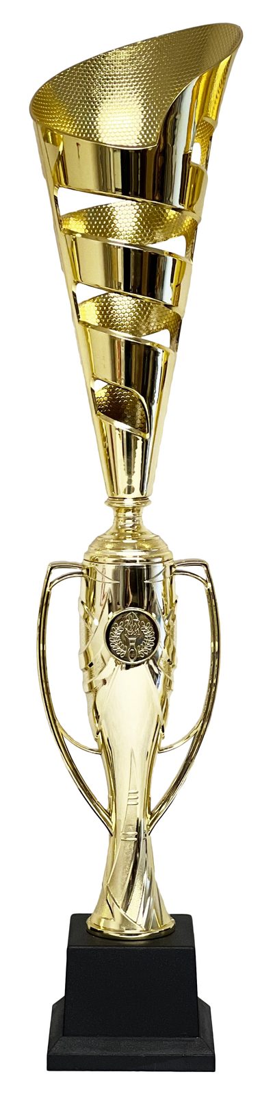The ECL2022/04 Gold  Cup is an elegant trophy cup award. Made from a large plastic bowl with  mounted on a plastic column. The cup is then fixed to weighted PVC base.  Select from 3 sizes.