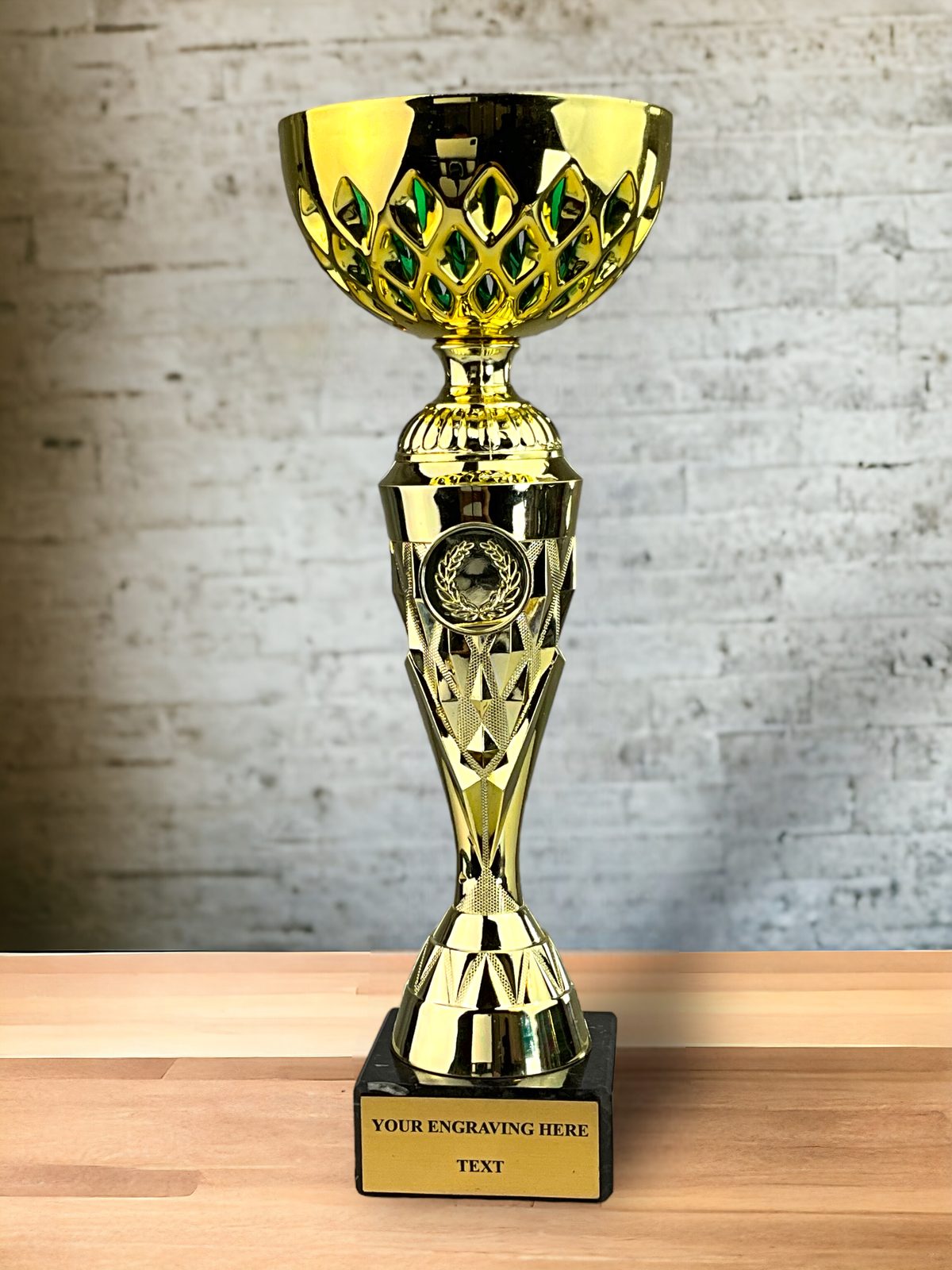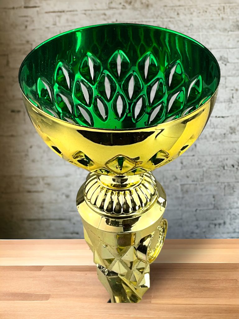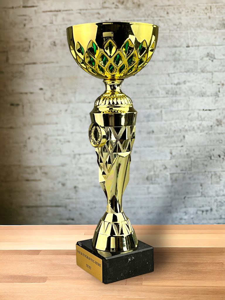 The ECL2022/07 Gold and Green Cup is an elegant trophy cup award. Made from a large metal bowl with ornate  mounted on a plastic column. The cup is then fixed to weighted marble base.  Select from 4 sizes.