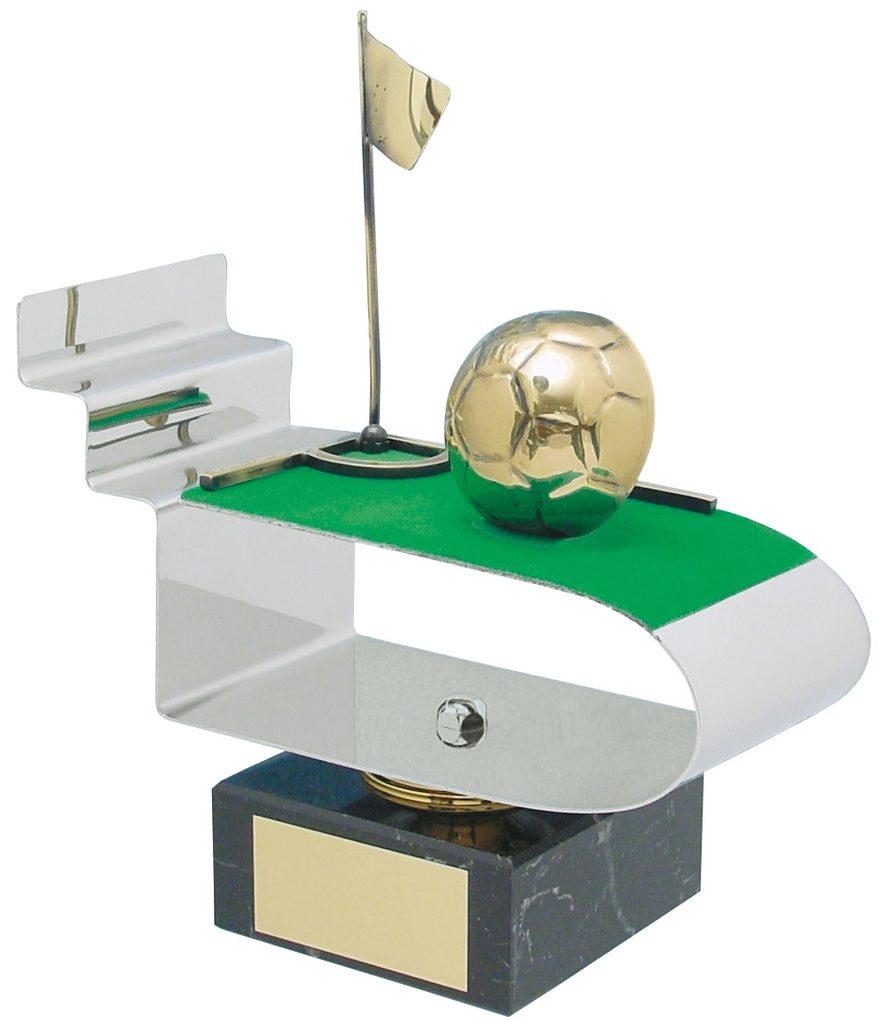 The Eibar Soccer ball Corner Flag Soccer ball Trophy is an exclusive handmade metal award displaying an artistic soccer ball and corner flag sitting on green felt. This is then mounted onto a high quality black marble base. The award is part of an exclusive collection of awards that are handmade in Barcelona, Spain. Each trophy is hand crafted from high quality metals, including brass, copper, nickel, pewter and steel and are set upon either wooden or marble bases.