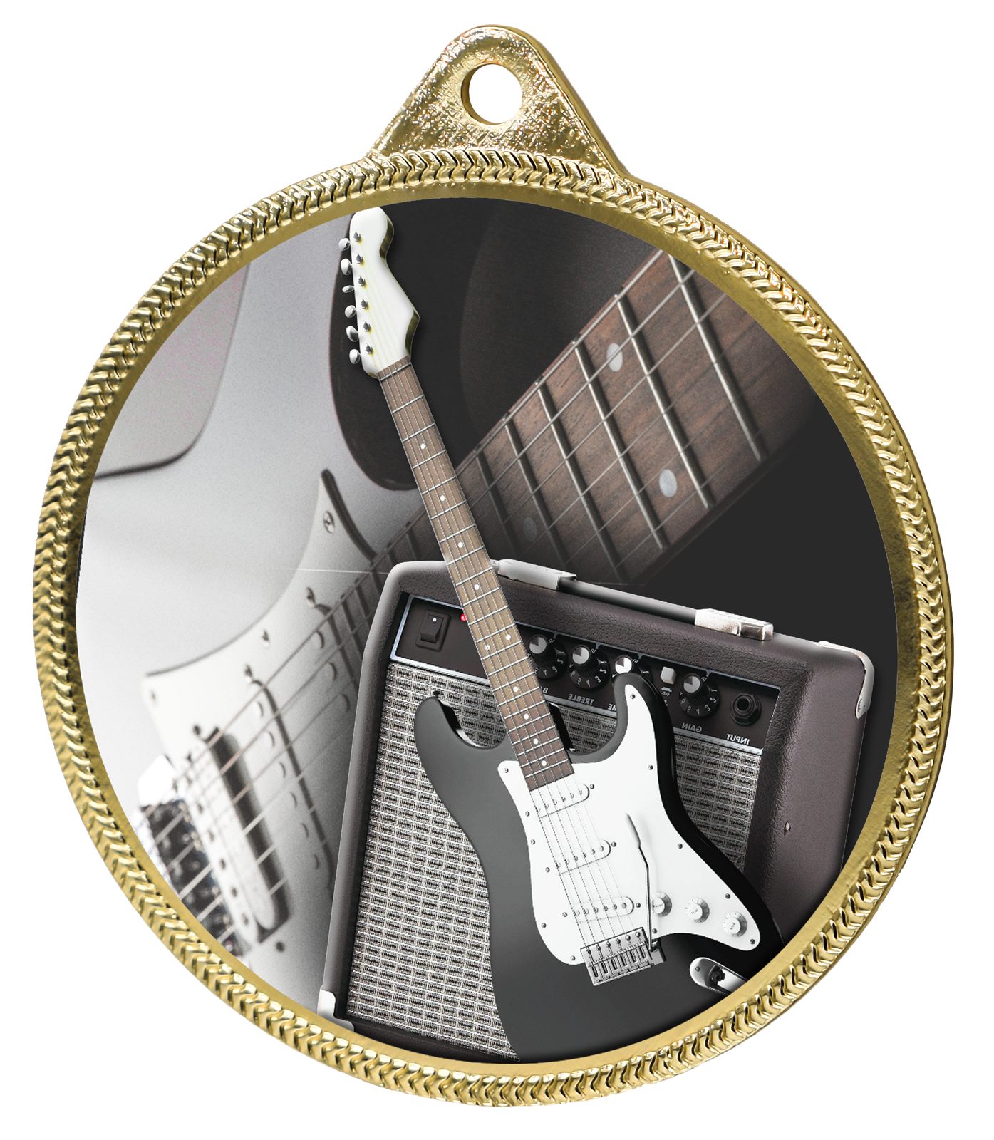 A truly superb new Electric Guitar 2 1/8" medal made from iron. The medal has been printed using the latest 3D texture coating making the medal come alive with a vibrant raised full colou print. Give your next presentation a lift with these contemporary medals which are sure to make eyes light up when received!
