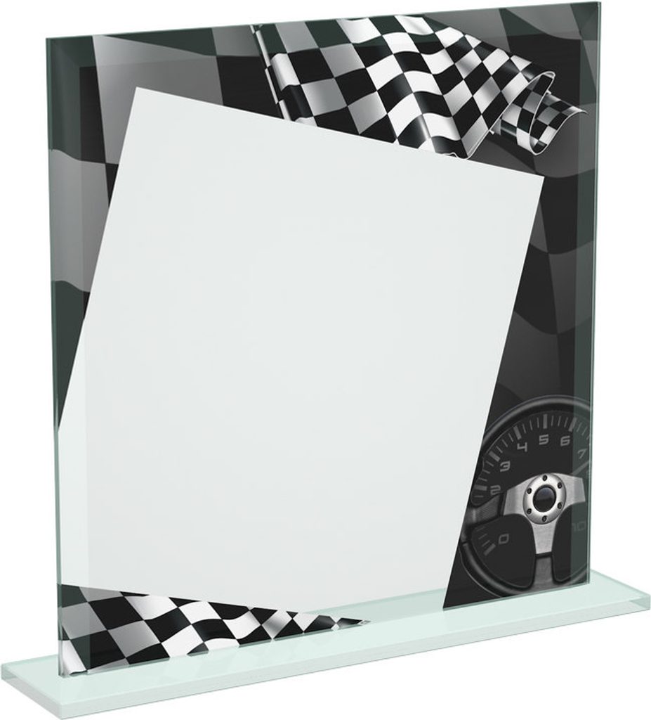 Celebrate every checkered flag, podium finish, and championship win with the Eloise Motorsport Color-Printed Glass Award. Made from ¼" thick premium glass in 5 ¾", 6 ¾", and 7 ½" sizes, it features a vibrant full-color UV motorsport design with checkered pattern and speed graphics, plus a clear glass panel for your logo and text. Ideal for karting, club racing, track days, and motorsport awards nights.