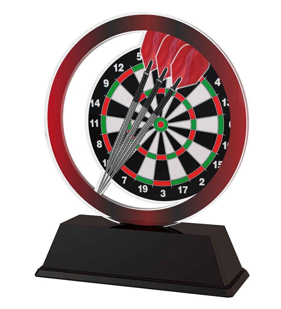 The Essen Darts Trophy is the latest in design. Cut out to shape this trophy comes to life with a high quality full color print on the reverse side of the 5/32" thick acrylic mounted on a black PVC base.