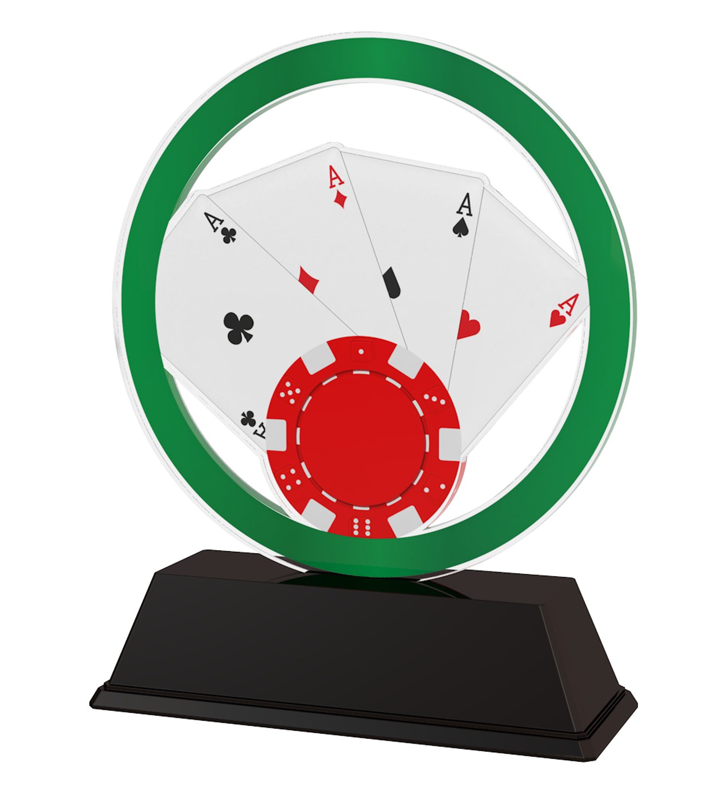 The Essen Poker Trophy is the latest in design. Cut out to shape this trophy comes to life with a high quality full color print on the reverse side of the 5/32" thick acrylic mounted on a black PVC base.