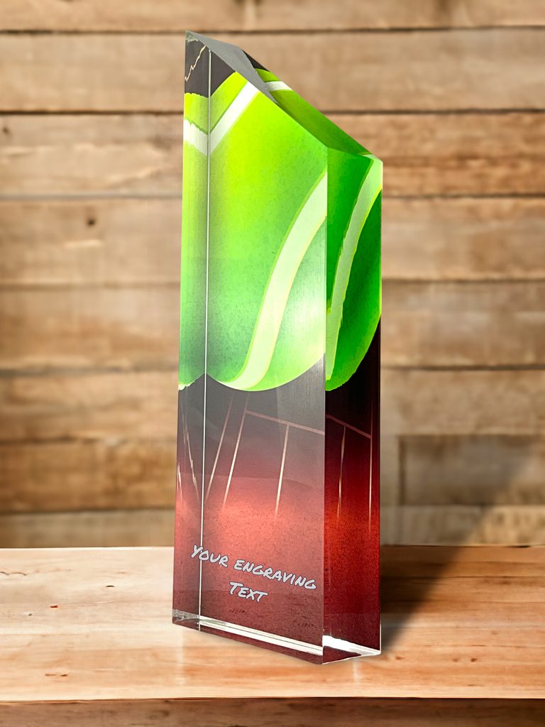 The Everest Tennis Ball Trophy is an impressive free standing award. This trophy features a high quality full color print on the reverse side of 1" ultra-thick acrylic.