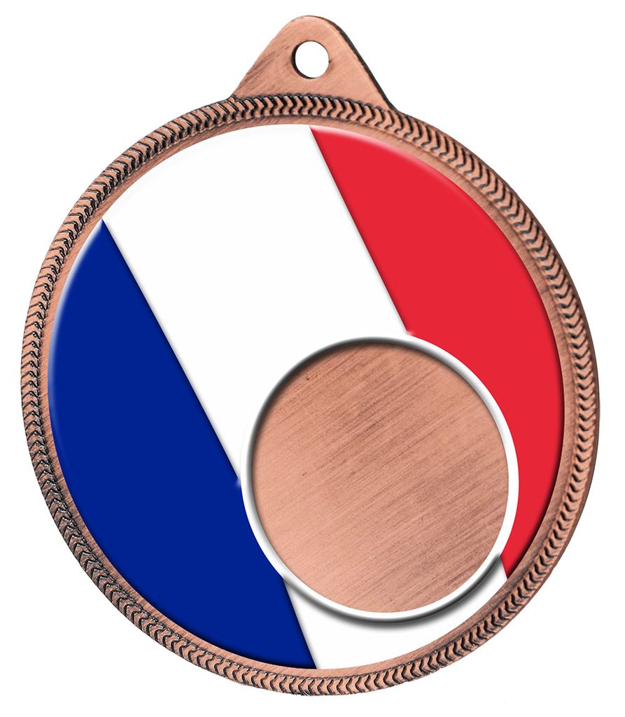 The France Flag Logo Insert Bronze Medal is exclusive to Trophy Monster. Give out medals to remember with this uniquely designed metal  2 1/8" medal. The medal has been printed using the latest 3D texture coating technology making the medal come alive with a vibrant raised full color print.