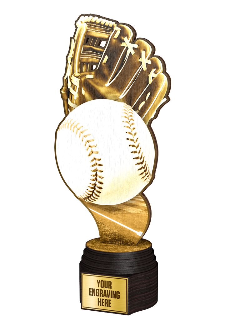 The Frontier Classic Real Wood Baseball Trophy is an impressive eco friendly award made from 3/8" thick natural birch plywood, mounted on a thick wooden base. A sustainable product that is part of a collection designed and manufactured in our own factory. Not only for the environmentally conscious, this trophy will be the centrepiece in any presentation.