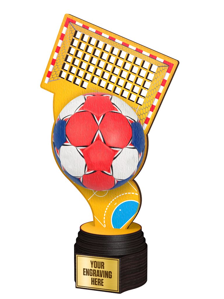 The Frontier Real Wood Handball Football Trophy is an impressive eco friendly award made from 3/8" thick natural birch plywood, mounted on a thick wooden base. A sustainable product that is part of a collection designed and manufactured in our own factory. Not only for the environmentally conscious, this trophy will be the centrepiece in any presentation.