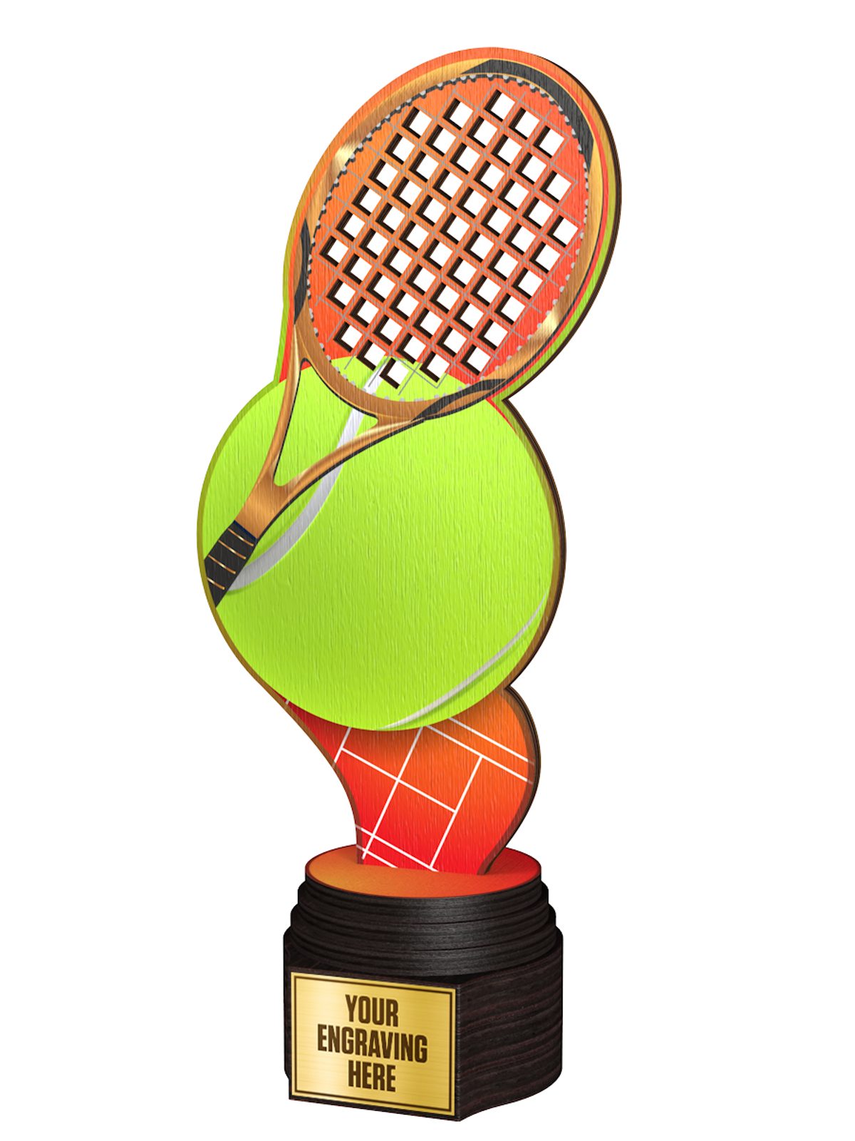 The Frontier Real Wood Tennis Trophy is an impressive eco friendly award made from 3/8" thick natural birch plywood, mounted on a thick wooden base. A sustainable product that is part of a collection designed and manufactured in our own factory. Not only for the environmentally conscious, this trophy will be the centrepiece in any presentation.