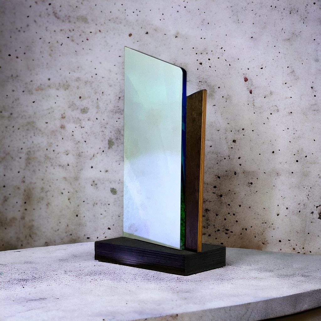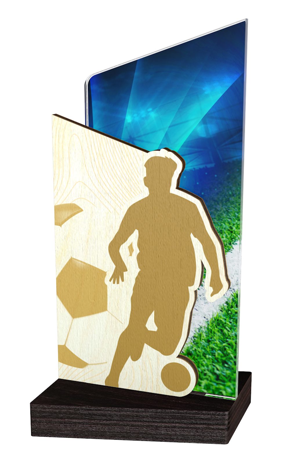 The Fusion Soccer Trophy is a modern-style award. A totally unique concept trophy made with a combination of 15/64" thick beveled acrylic and 15/64" natural sustainable birchwood. The award is mounted on a specially designed angled birchwood base. Made exclusively in our own factory this trophy is sure to be the centerpiece in any presentation.