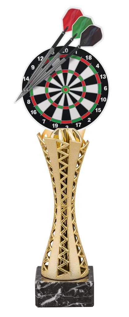 The Genoa Darts Trophy is the latest in contemporary design. Watch eyes light up when presenting this award, with the high quality full color print on the reverse side of 5/32" thick acrylic mounted on an attractive gold weave effect column, which itself is mounted on a black marble base.