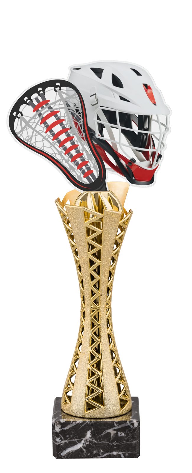 The Genoa Lacrosse Trophy is the latest in contemporary design. Watch eyes light up when presenting this award, with the high quality full color print on the reverse side of 5/32" thick acrylic mounted on an attractive gold weave effect column, which itself is mounted on a black marble base.