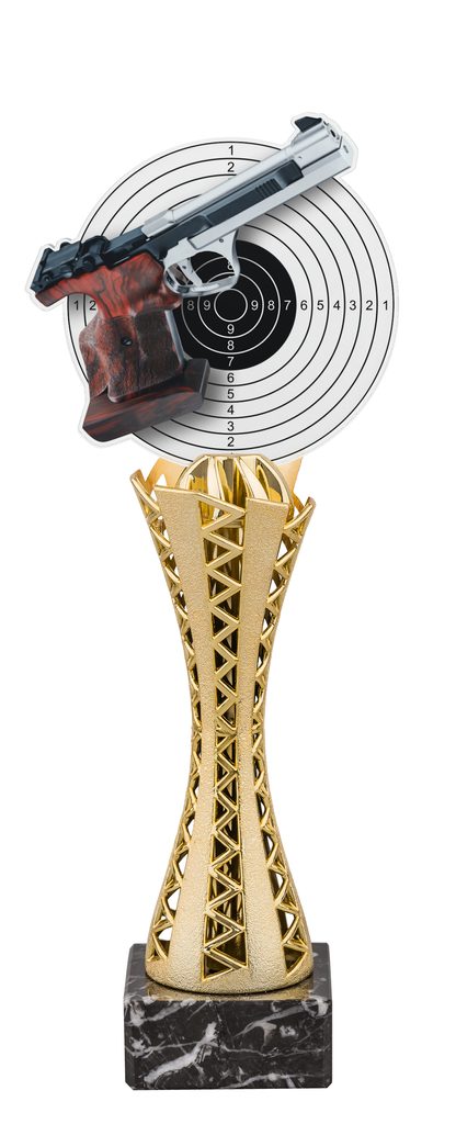 The Genoa Pistol Shooting Trophy is the latest in contemporary design. Watch eyes light up when presenting this award, with the high quality full color print on the reverse side of 5/32"  thick acrylic mounted on an attractive gold weave effect column, which itself is mounted on a black marble base.