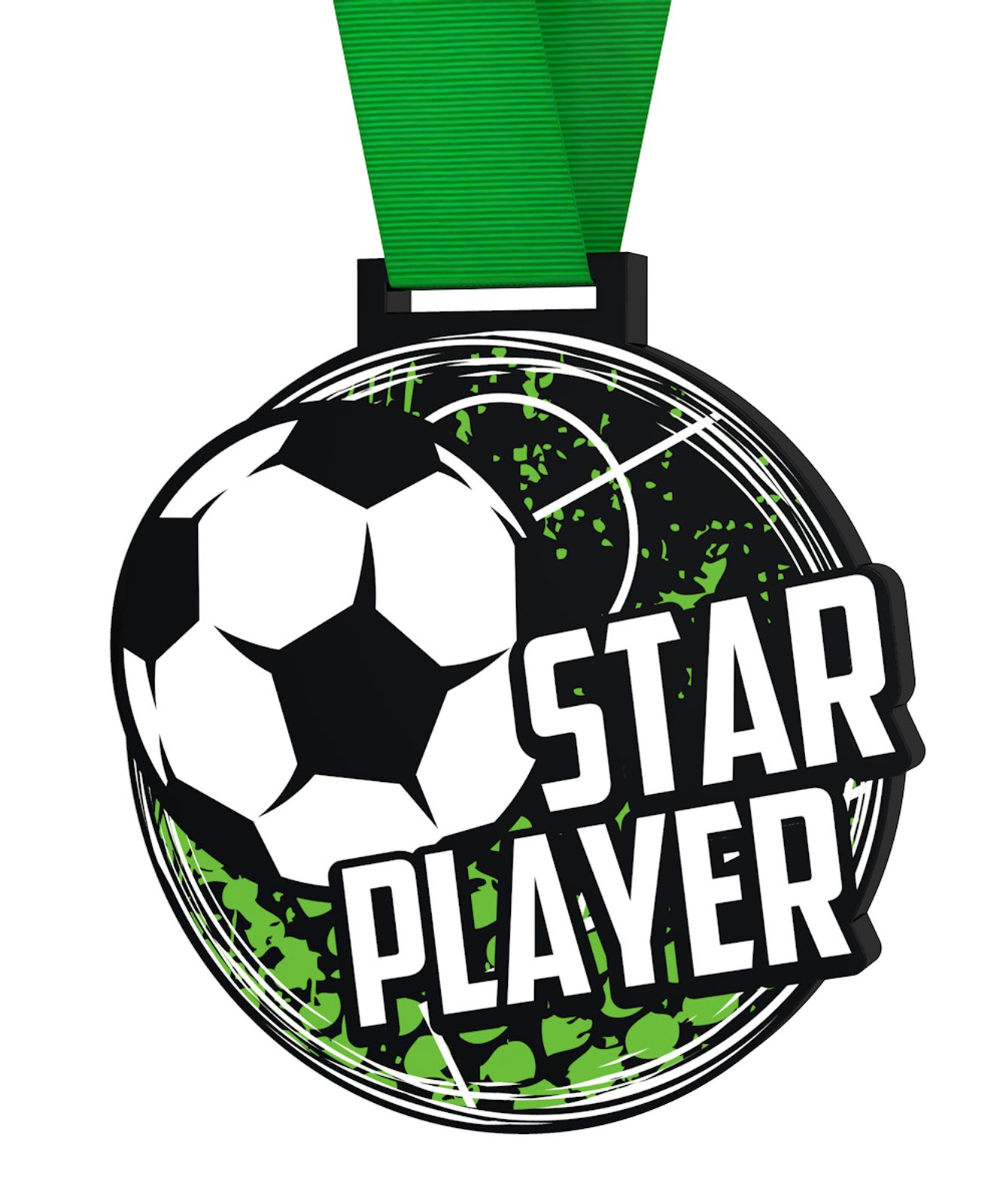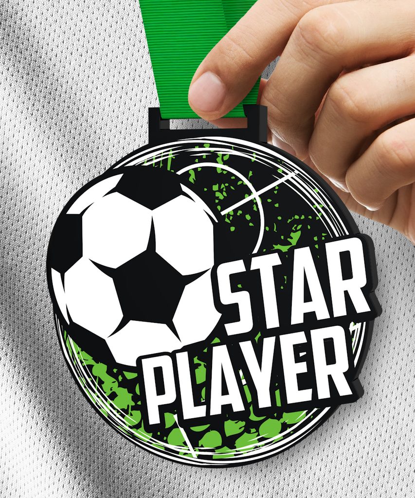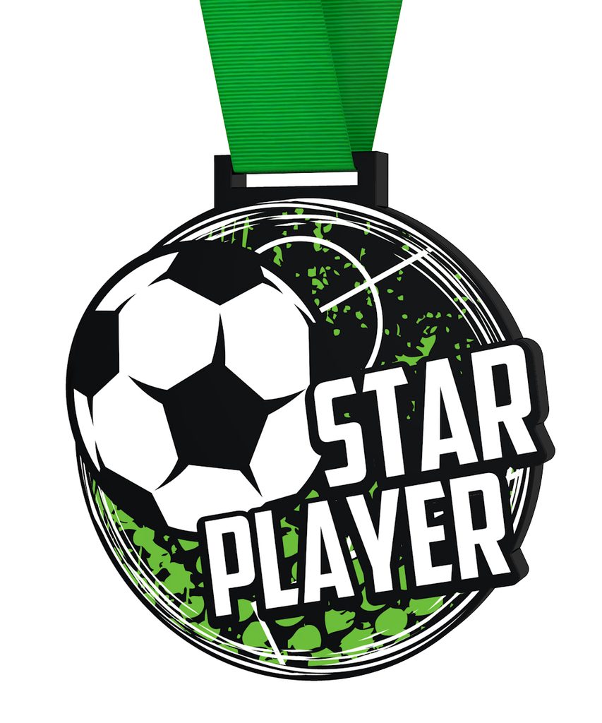 The Giant Soccer Star Player Medal is an impressive piece with a striking design that is exclusively manufactured by Trophy Monster. Crafted from a thick 5/16" black acrylic, this medal boasts a high-quality color print that is sure to catch the eye.