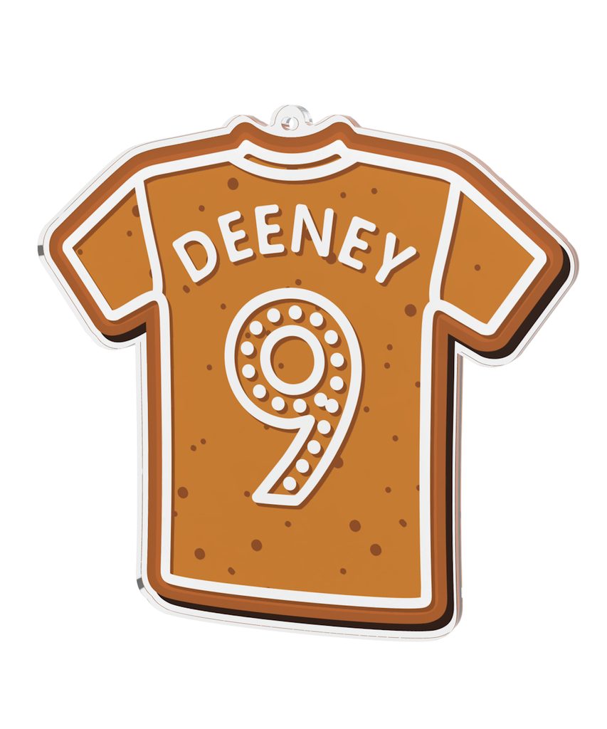 The custom made Gingerbread Sports Shirt is a unique Christmas tree hanging ornament supplied complete with a gold hanging cord. No set-up or origination charges.