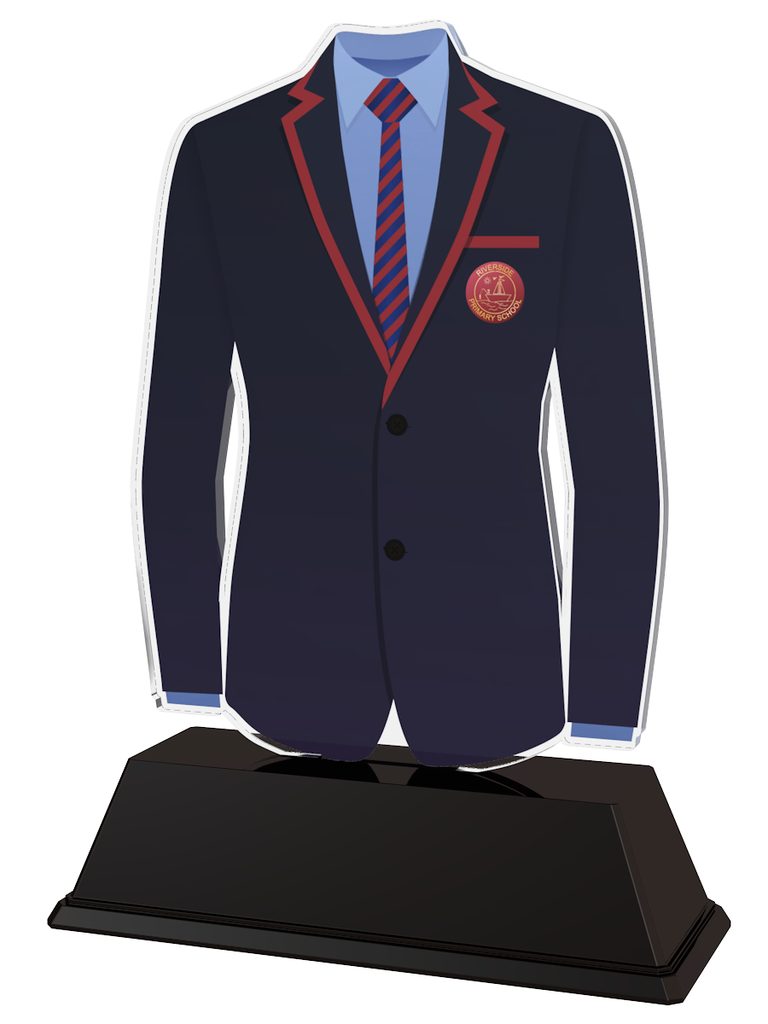 Have your schools actual unform custom printed onto the fabulous School Uniform Blazer Custom Acrylic Award. No set-up or origination charges. Cut to shape this trophy comes to life with a high quality full colour front and back print on the 4mm thick acrylic. Simply upload an image of your schools uniform together with logo/badge. We will then email a proof for your approval before production.