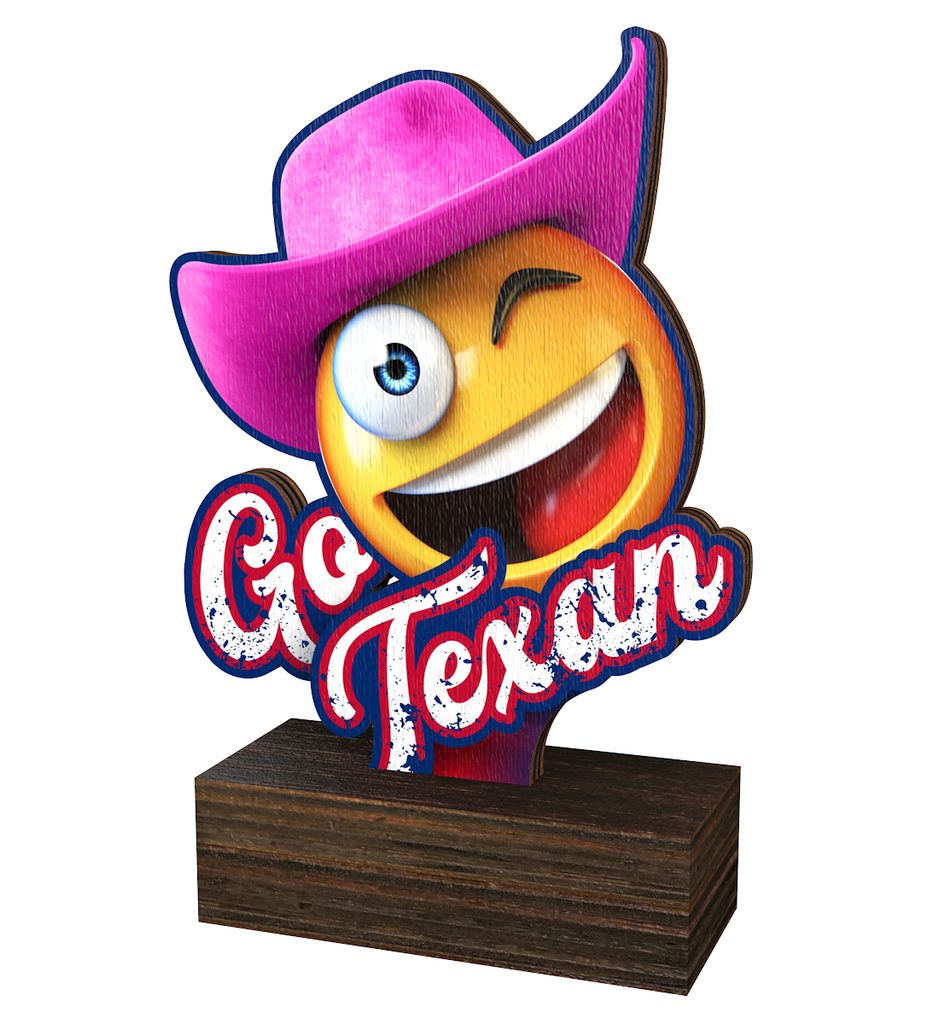 The Go Texan Pink Hat Real Wood Trophy is a brand new eco friendly award made from 5/16" thick natural birch plywood, mounted on a thick wooden rectangular base. A sustainable product that is part of a collection designed and manufactured in our own factory. Not only for the environmentally conscious, this trophy will be the centrepiece in any presentation.