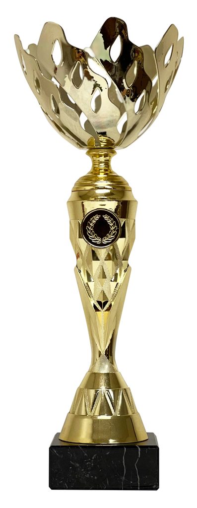 The Gold Cup ECL2022/23 is an elegant trophy cup award. Made from a large laser cut metal bowl   mounted on a plastic column. The cup is then fixed to weighted marble base.  Select from 4 sizes.