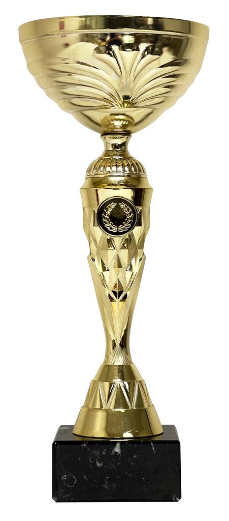 The Gold Cup ECL2022/27   is an elegant trophy cup award. Made from a large metal bowl with ornate  mounted on a plastic column. The cup is then fixed to weighted marble base.  Select from 3 sizes.