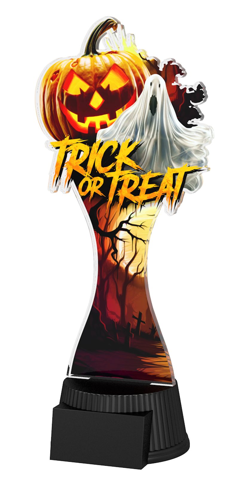 Halloween Trick or Treat Trophy is a very scary award indeed. Cut to shape this trophy features a high quality full colour print on the reverse side of the 1/4" thick acrylic mounted on a black PVC base.