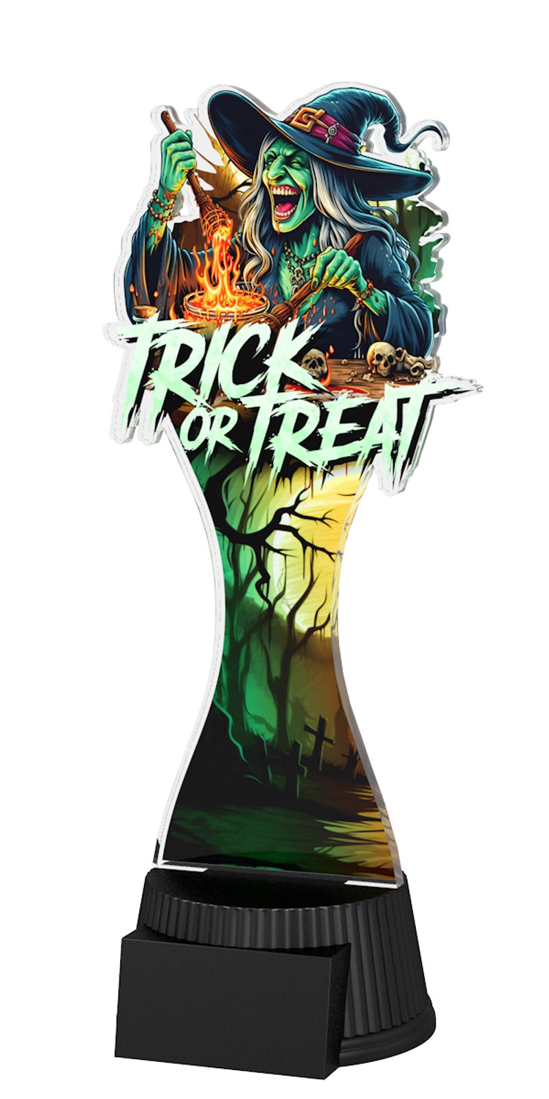 Halloween Trick or Treat Trophy is a very scary award indeed. Cut to shape this trophy features a high quality full colour print on the reverse side of the 1/4" thick acrylic mounted on a black PVC base.